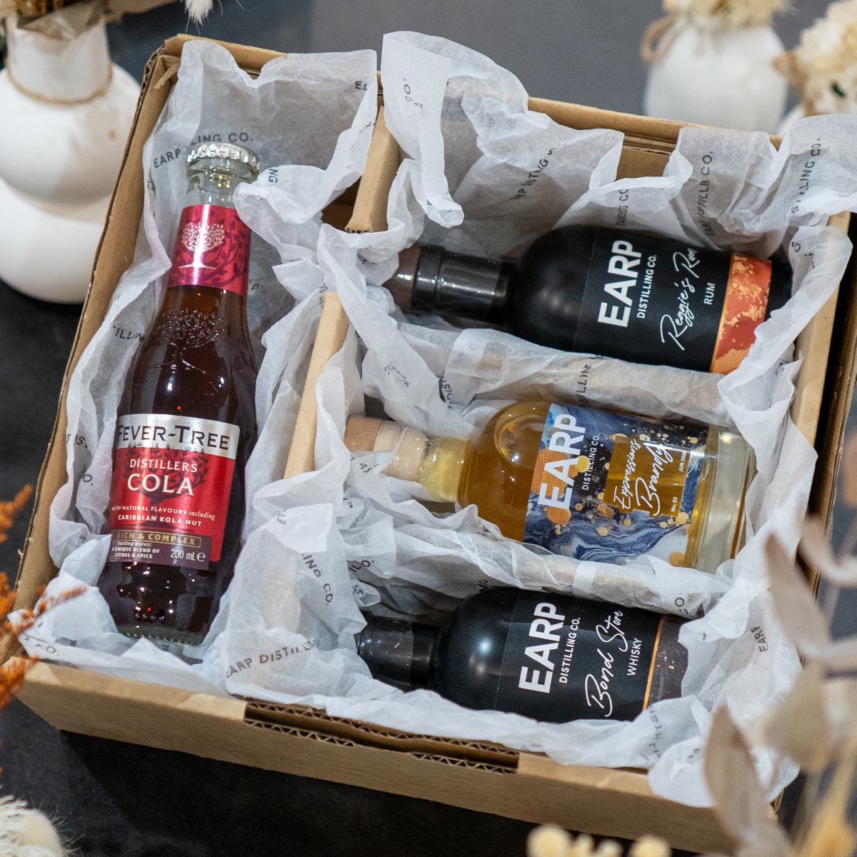 200mL Expressions Brandy (40% ABV, 6.3 Standard Drinks), 200mL Bond Store Whisky (43% ABV, 6.8 Standard Drinks), 200mL Reggie's Rum (40% ABV, 6.3 Standard Drinks), 200mL Fever-Tree Distiller’s Cola