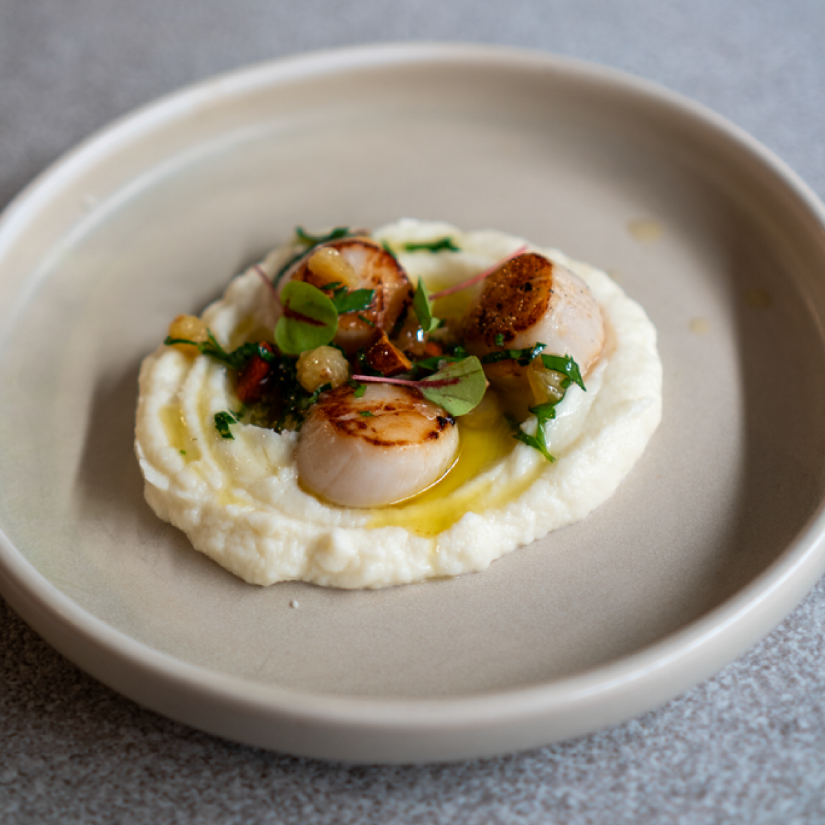 Canadian Scallops w. Cauliflower Purée, Almond, Golden Raisins