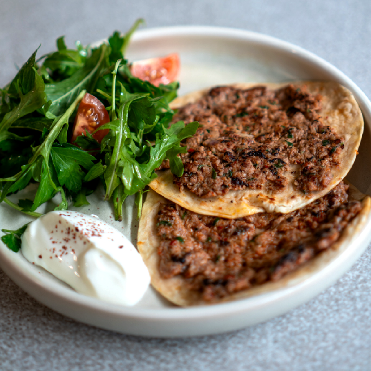 Lahmacun w. Beef, Tomato, Yogurt, Lemon, Mixed Herb Salad